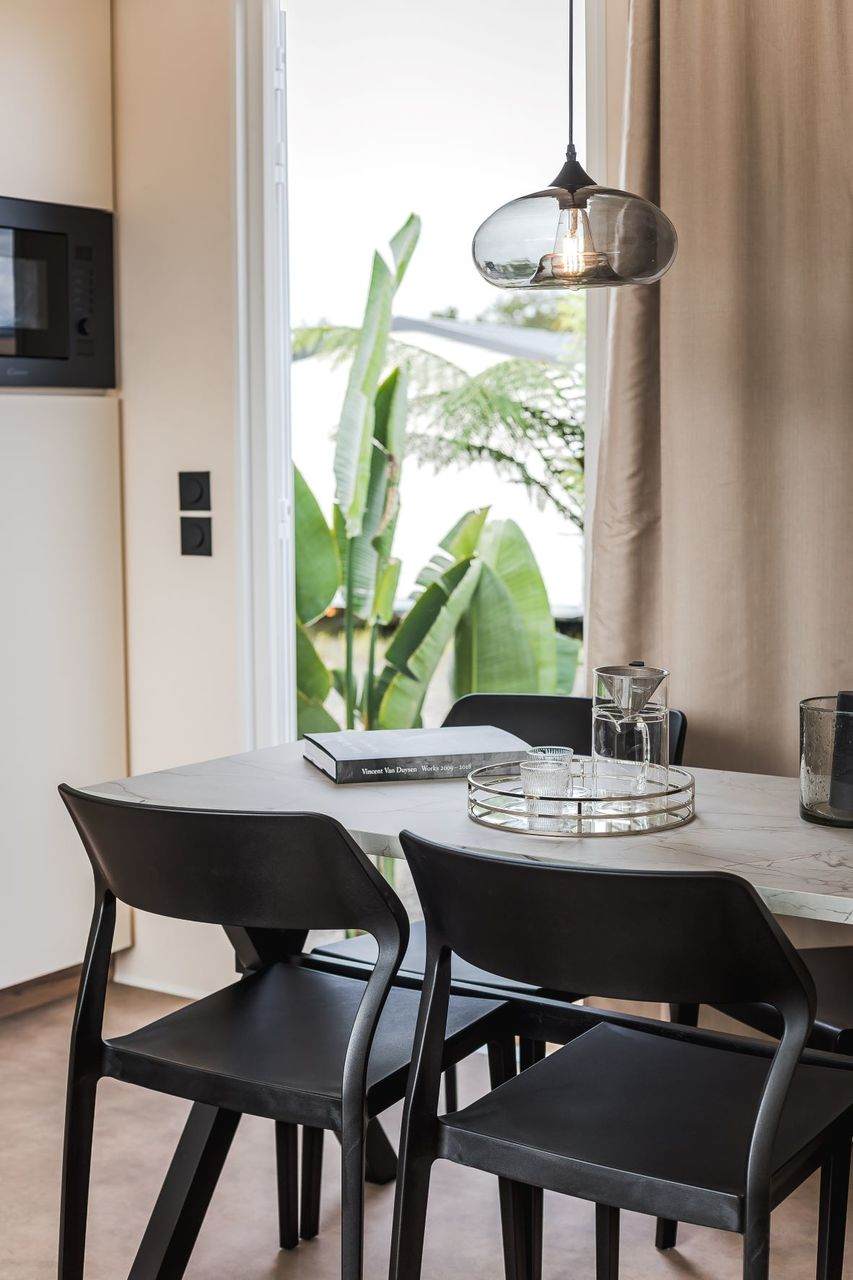 Area pranzo: Tavolo da pranzo 148 x 65 cm con 6 sedie, lampada a sospensione sopra il tavolo, mobile contenitore semi-aperto.